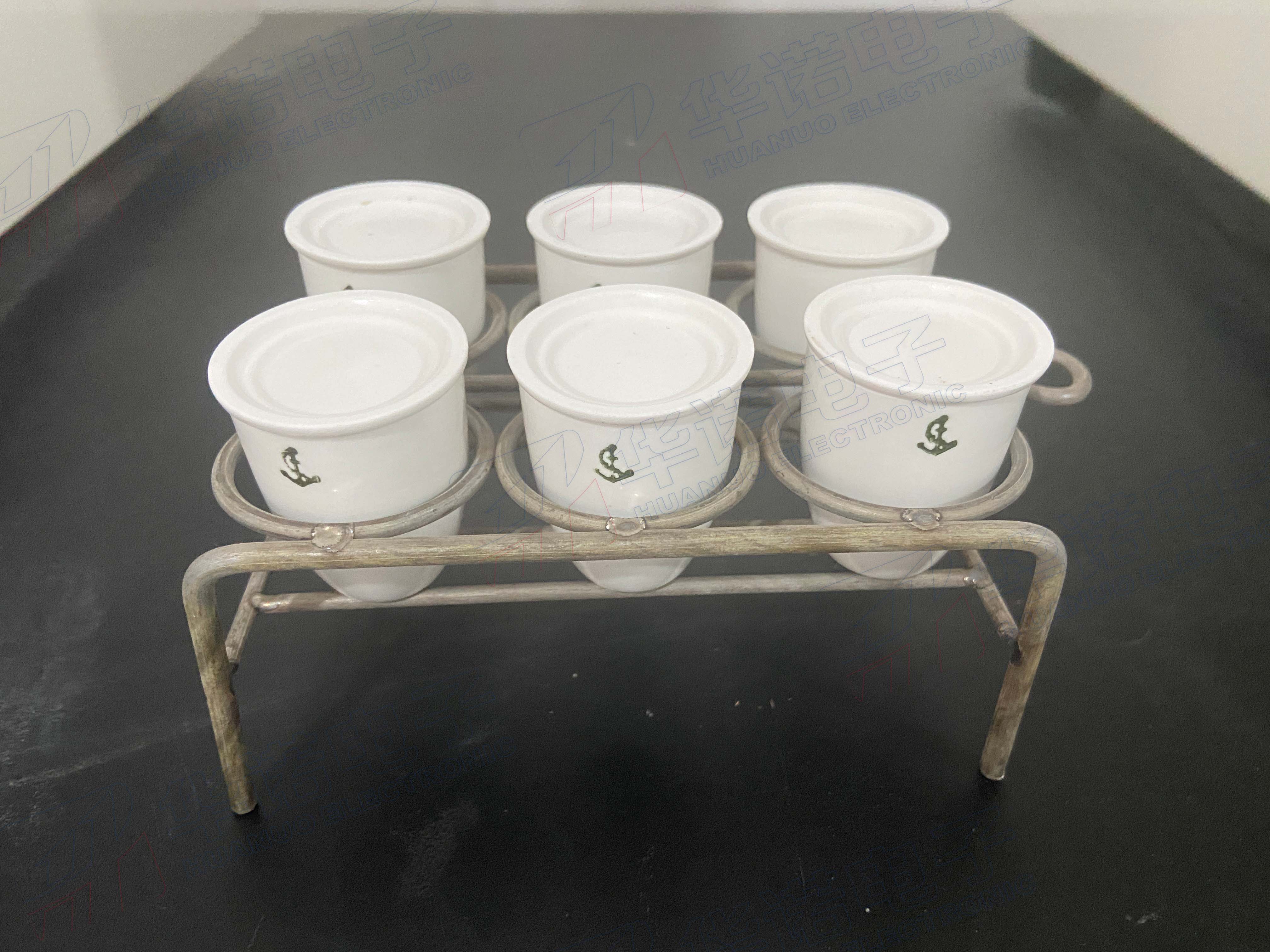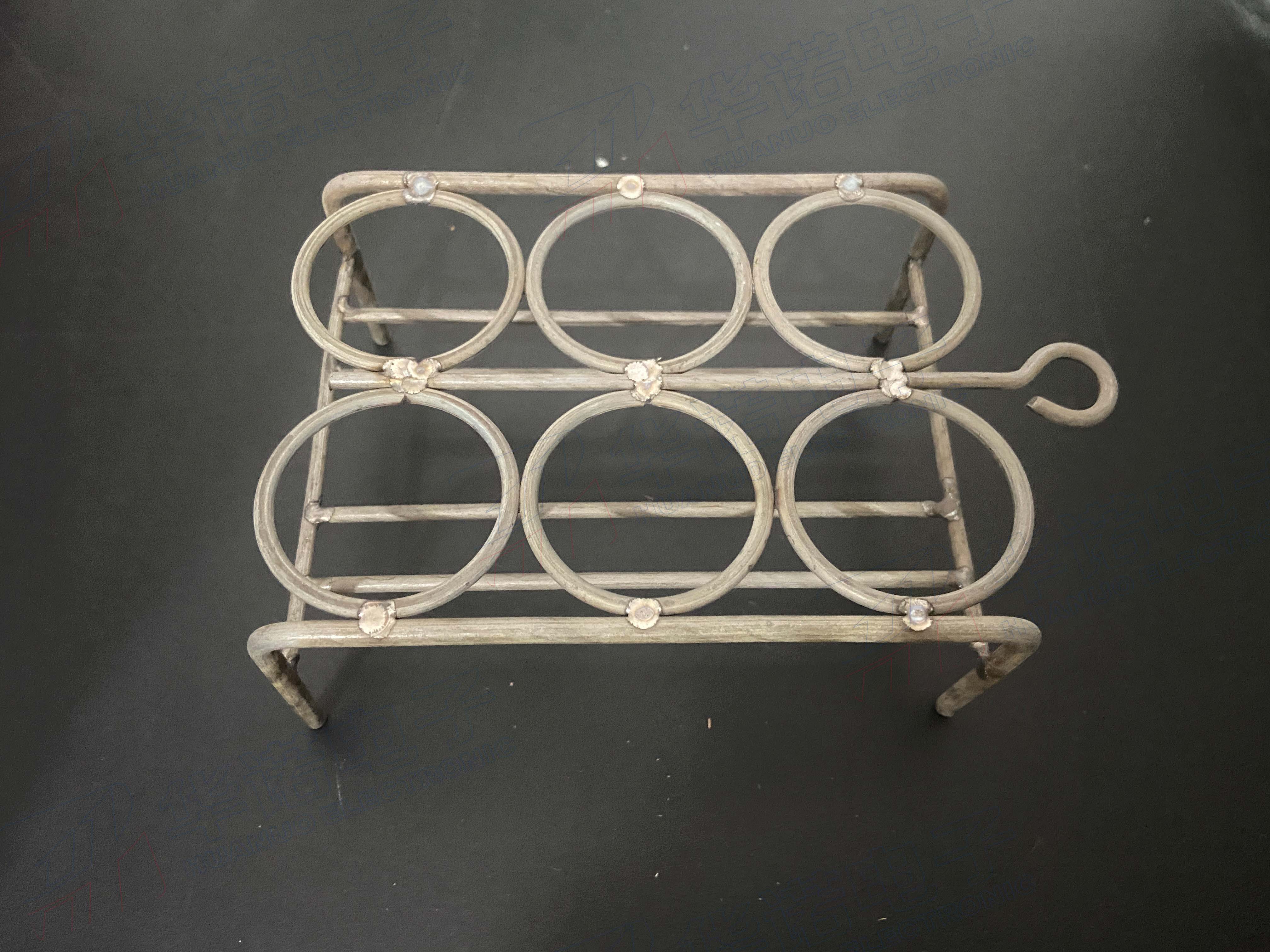 坩堝架:用鎳鉻絲或其他耐熱金屬絲制成。其規(guī)格尺寸以能使所有的坩都在馬弗爐恒溫區(qū)內(nèi),并且坩堝底部緊鄰熱電偶熱接點(diǎn)上方(見圖5)。