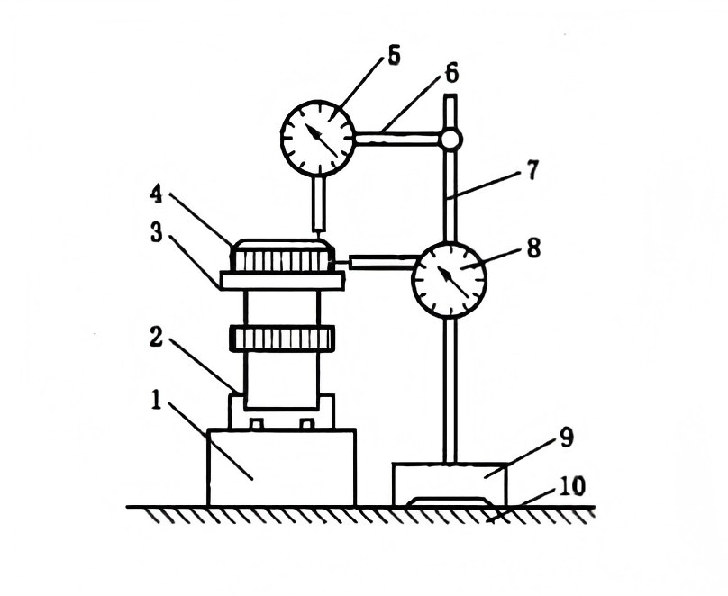 4.1.3將彈體安裝到平臺的卡盤上,卡緊。套上試驗環(huán),再將連接環(huán)裝到彈體上,擰4~5。調(diào)整磁性表摩和橫桿的位置,使兩個千分表(5)和(8)分別與連接環(huán)頂部和側(cè)面平滑部分剛好4.1.4接觸。