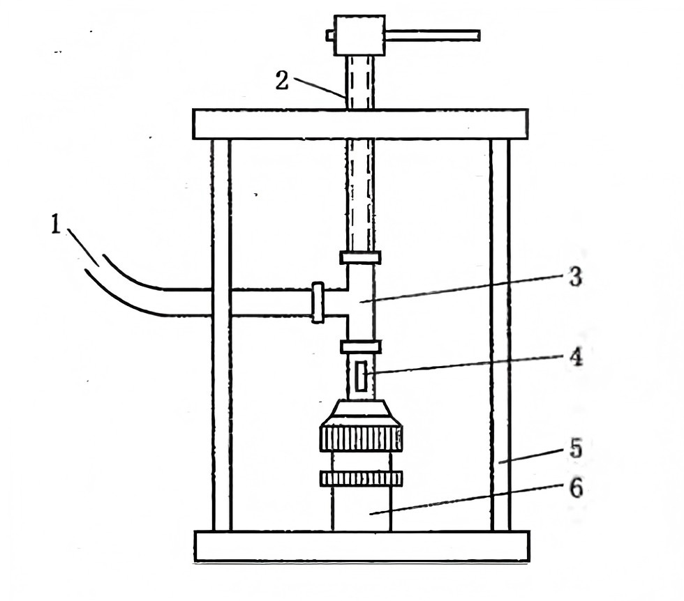 1——接壓力試驗機(jī);2——絲杠;3——兩通;4——進(jìn)水閥;5——氧彈固定架;6——氧彈