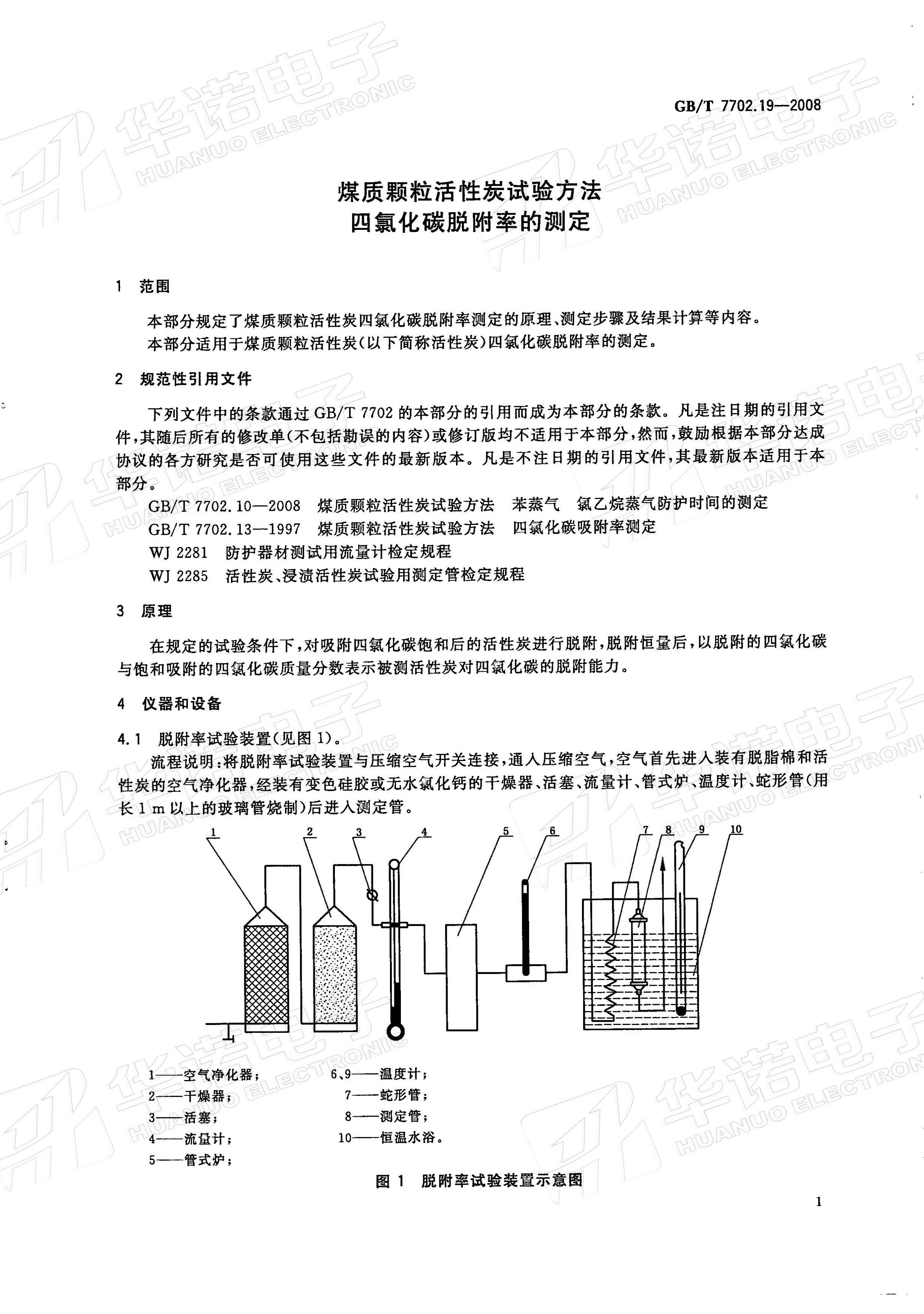 《GBT7702.19-2008煤質(zhì)顆粒活性炭試驗(yàn)方法四氯化碳脫附率的測(cè)定》本部分規(guī)定了煤質(zhì)顆?;钚蕴克穆然济摳铰实脑恚瑴y(cè)定步驟及結(jié)果計(jì)算等內(nèi)容。本部分適用于煤質(zhì)顆粒活性炭四氯化碳脫附率的測(cè)定。在規(guī)定的試驗(yàn)條件下,對(duì)四氯化碳飽和后的活性炭進(jìn)行脫附,脫附恒量后,以脫附的四氯化碳與飽和吸附的四氯化碳質(zhì)量分?jǐn)?shù)表示被測(cè)活性炭對(duì)四氯化碳的脫附能力。