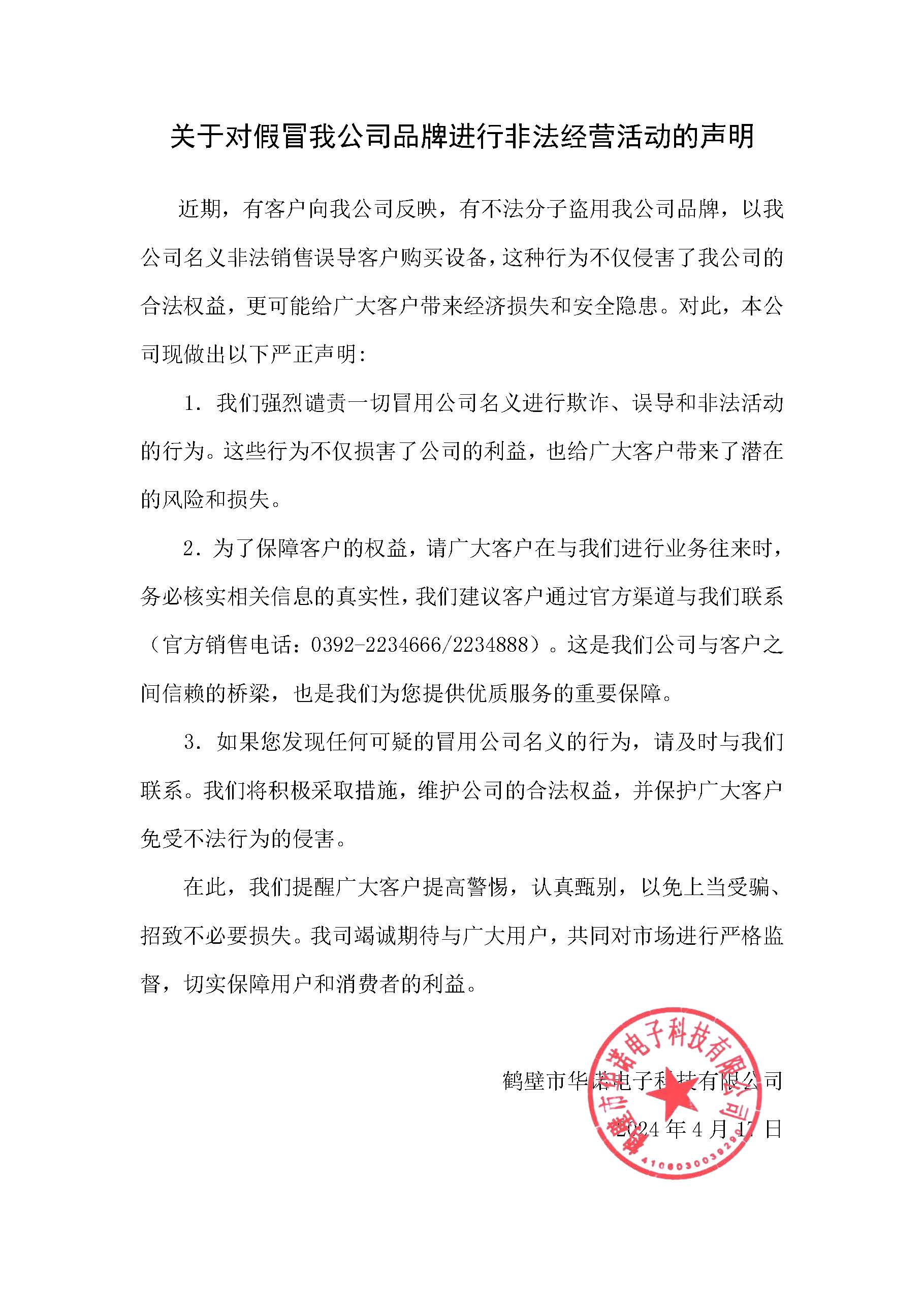 近期,有客戶向我公司反映,有不法分子盜用我公司品牌,以我公司名義非法銷售誤導(dǎo)客戶購買設(shè)備,這種行為不僅侵害了我公司的合法權(quán)益,更可能給廣大客戶帶來經(jīng)濟(jì)損失和安全隱患。對此,本公司現(xiàn)做出以下嚴(yán)正聲明: